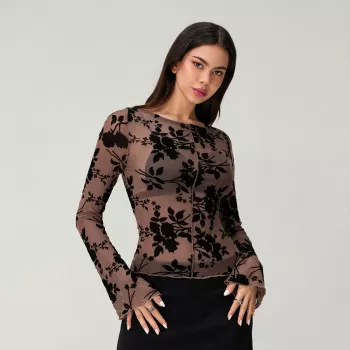 Women's Spring Floral Print Mesh Slim Cropped Long Sleeve Sexy T-Shirt